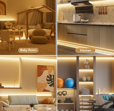 Hidden LED strips behind molding or panels create subtle glow lighting.